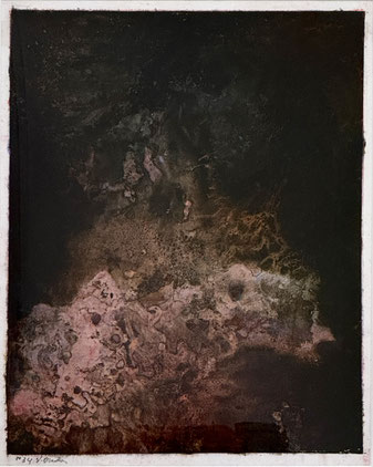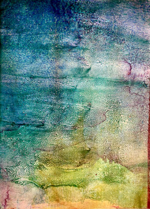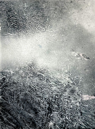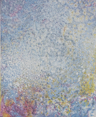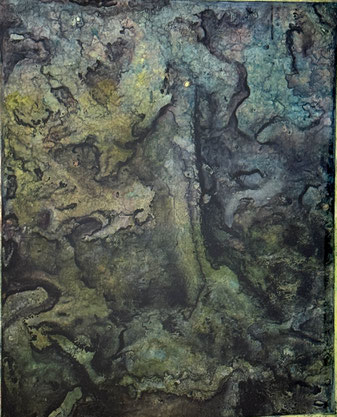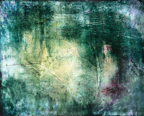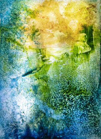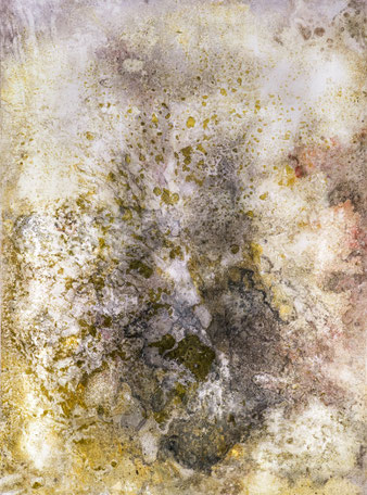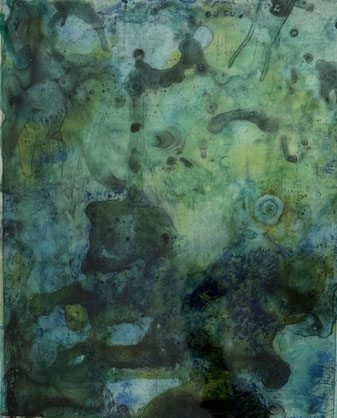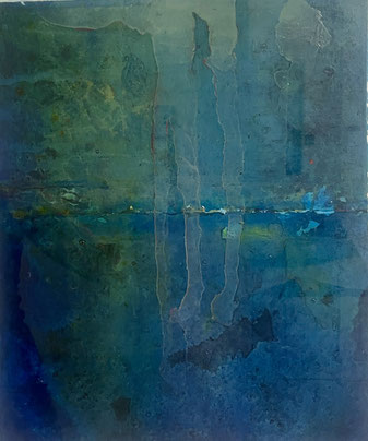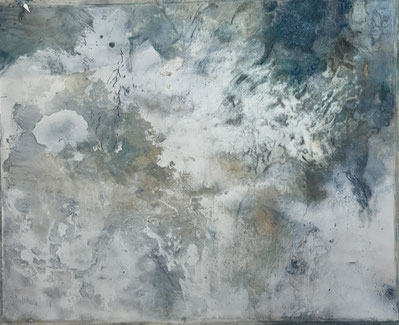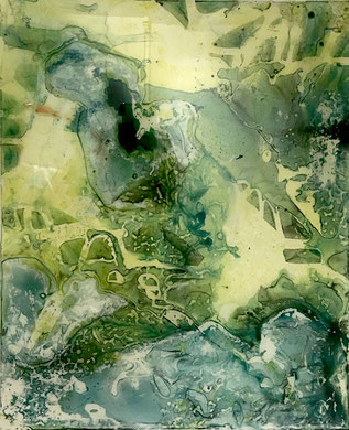 I add and subtract into the painting surface by pouring paint, sanding, drawing and printing while simultaneously experimenting with chemical reactions to the surface. Thus, my studio becomes a laboratory for experimentation and an athanor for the interaction of diverse materials. I repeat these processes until the piece evolves into a finished state of multiple luminous layers, referring to water, the richness of the air and the unknown and attaining a higher level of physicality and contemplation."