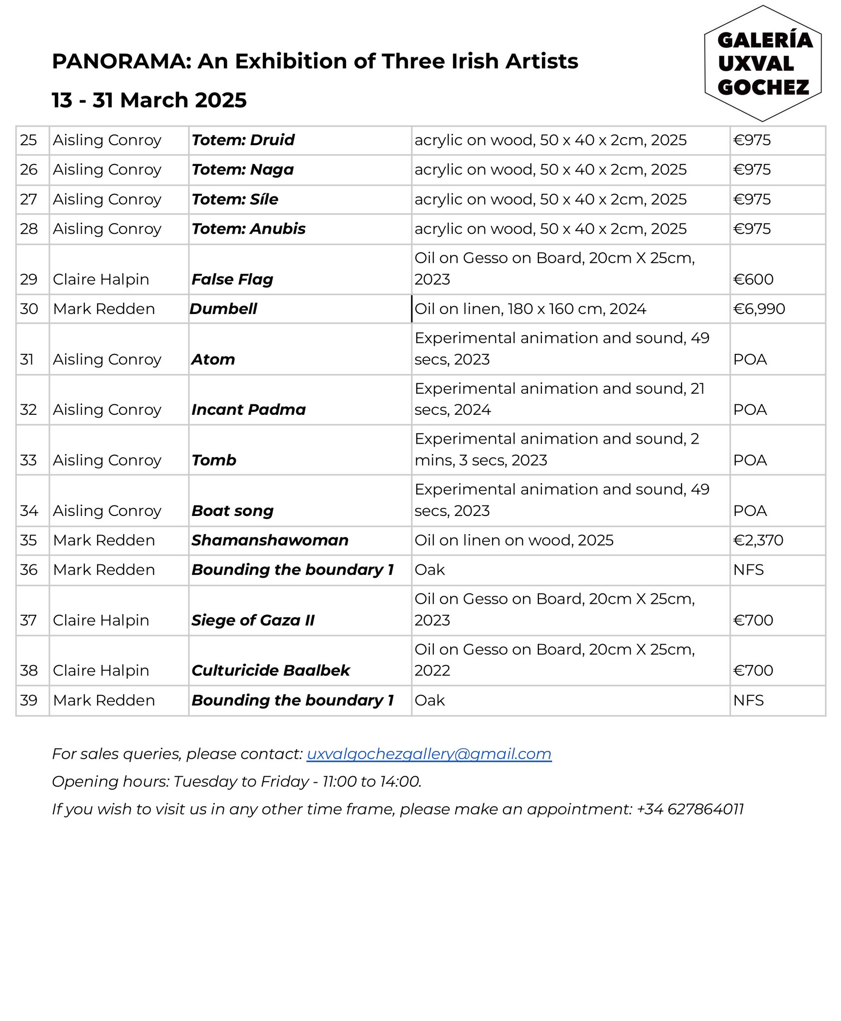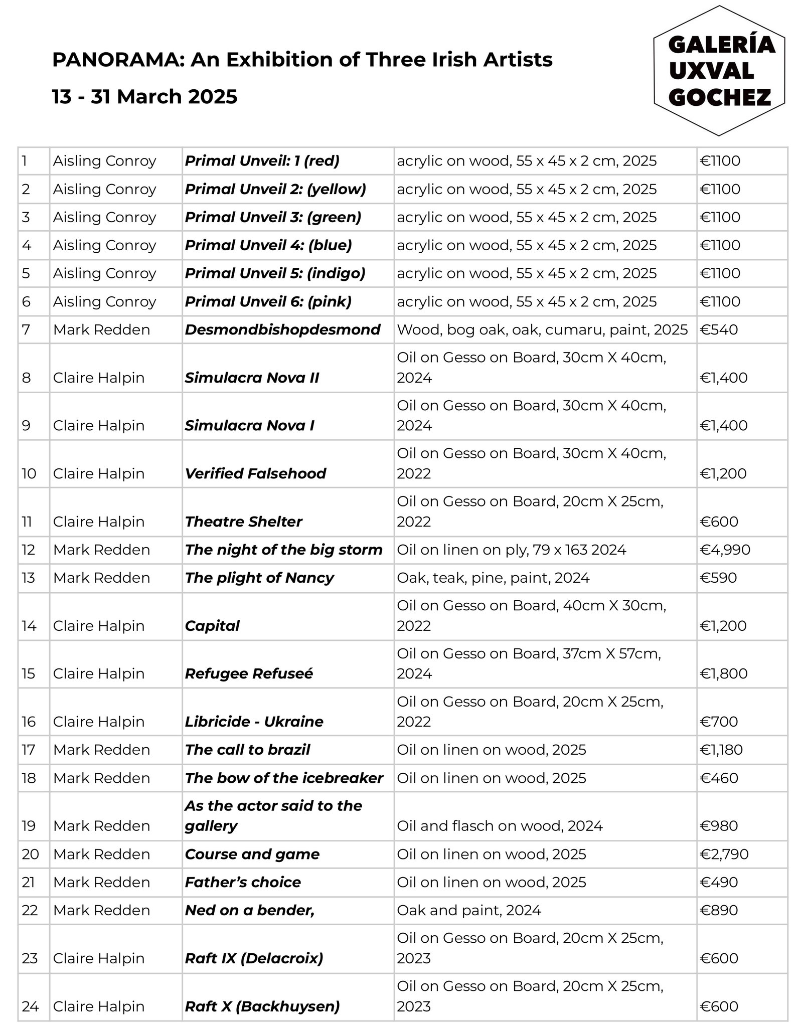 An Exhibition of 3 Contemporary Irish Artists – Aisling Conroy, Claire Halpin and Mark Redden at Uxval Gochez Gallery and Project Space in Barcelona in March 2025.