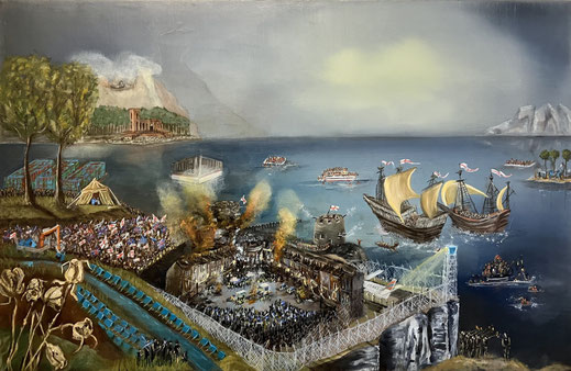 The means, methods and technologies of modern warfare from mass clandestine surveillance programs to unmanned warfare and its real time reporting through the lens of the media. The paintings employ imagery from the media, surveillance, military history, maps, archaeology, early civilization, bible stories and from the canon of art history of Byzantine and Early Renaissance to weave together a narrative through painting.