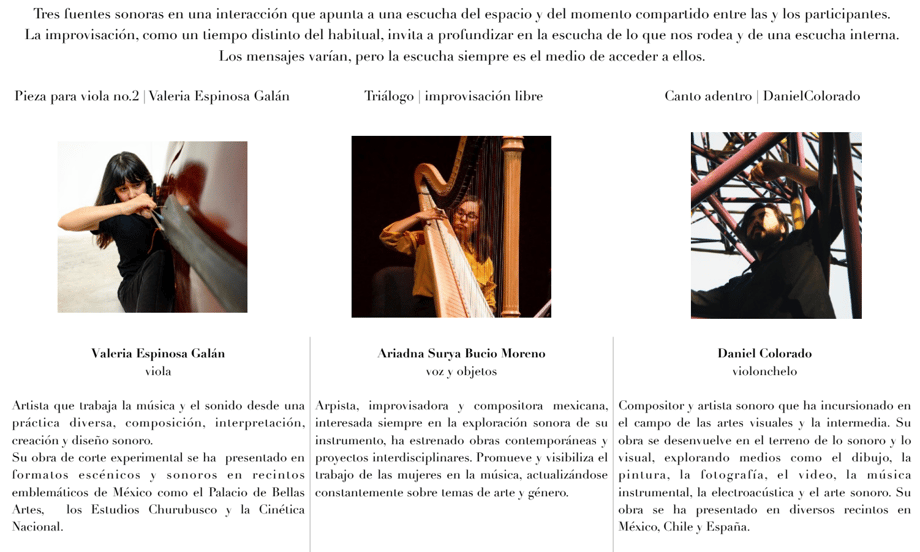 A Mexican harpist, improviser, and composer, always interested in the sonic exploration of her instrument. She has premiered contemporary works and interdisciplinary projects. She promotes and makes visible the work of women in music, continually updating herself on issues related to art and gender.